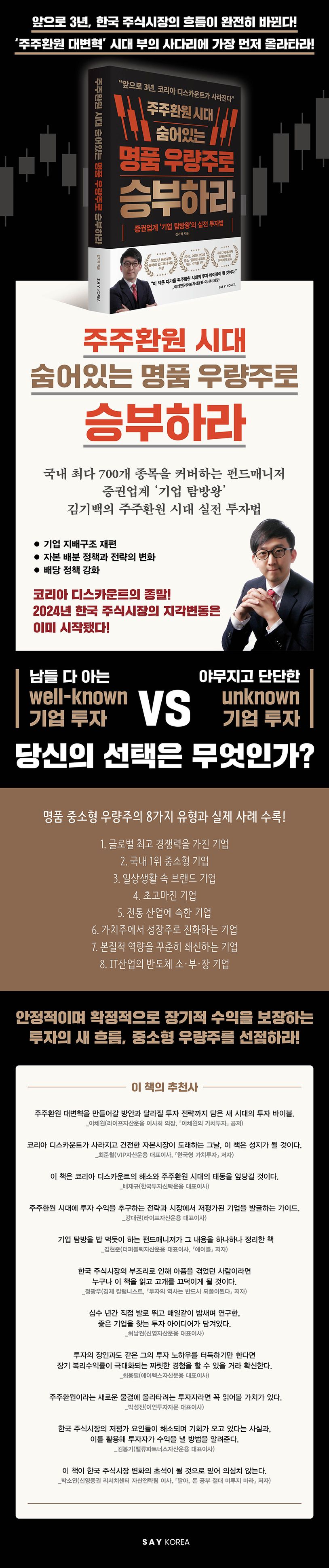 여기서 한발 더 나아가 저자는 지금 시장에서 비교적 소외된 중소형 우량주가 앞으로 이 흐름의 최대 수혜를 받을 수 있음을 설명하고, 실전 종목 분석과 선정 비법을 소개한다. 독자들은 이 책을 통해 주식시장의 재편을 맞아 새롭게 부의 사다리에 올라탈 수 있는 안정적이면서도 장기적인 방법을 확인할 수 있을 것이다.