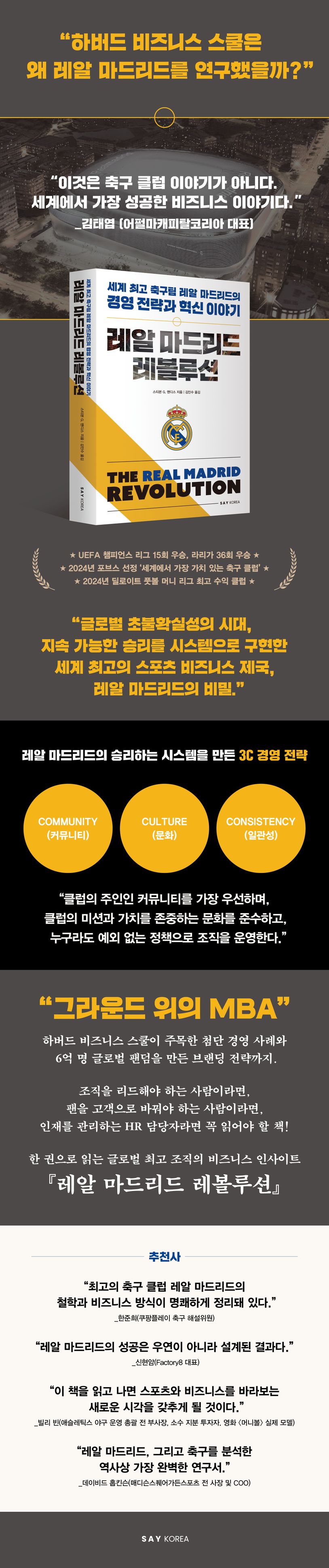 『레알 마드리드 레볼루션』은 국내 프로스포츠 구단들이 만성적인 적자 구조에 허덕이고, 기업들이 급변하는 시장 환경에서 생존 전략을 고심하는 지금 누구보다 명쾌한 해답을 제시한다. “가장 강력한 제약 조건을 가장 위대한 경쟁 우위로 바꾸는 법”을 보여주는 이 책은 경영자, 마케터, 인사 담당자들에게 단순한 스포츠 이야기를 넘어선 비즈니스 바이블이 될 것이다.