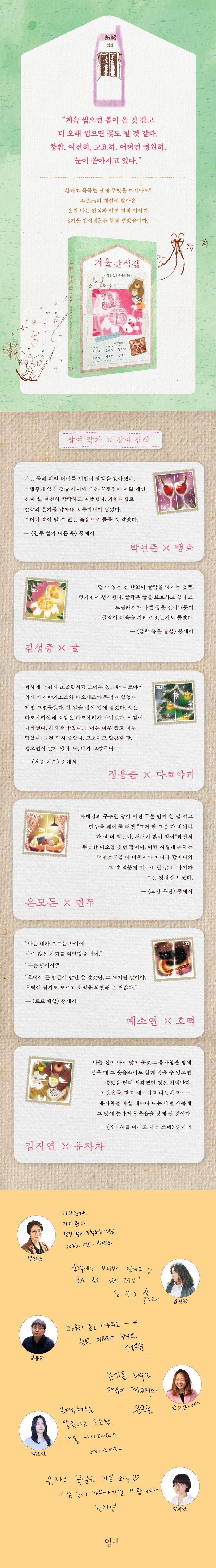 겨울은 화려한 거리의 풍경을 뒤로하고 의뭉스러운 이들과 적적한 연말을 보내거나(〈귤락 혹은 귤실〉), 동상이몽의 가족 모임에서 벗어나 아늑한 얼굴들을 찾아 연시를 맞이하는(〈모닝 루틴〉) 도피의 계절. 나도 모르는 사이에 외면했을 많은 기회를 되새기며(〈포토 메일〉), 켜켜이 쌓인 추억과 영원의 다른 이름을 들여다보는(〈유자차를 마시고 나는 쓰네〉) 회고의 계절. 곁과 마음에 자주 타인이 머무는 이 계절에 우리는 영영 놓아버린 관계를 더듬어보거나(〈한두 벌의 다른 옷〉), 변함없이 사랑하는 사람의 안녕을 빌어보기도 한다(〈겨울 기도〉). 그리고 익숙한 모양새로 우리 앞에 놓일 간식들은 그 모든 풍경을 소환할 것이다.