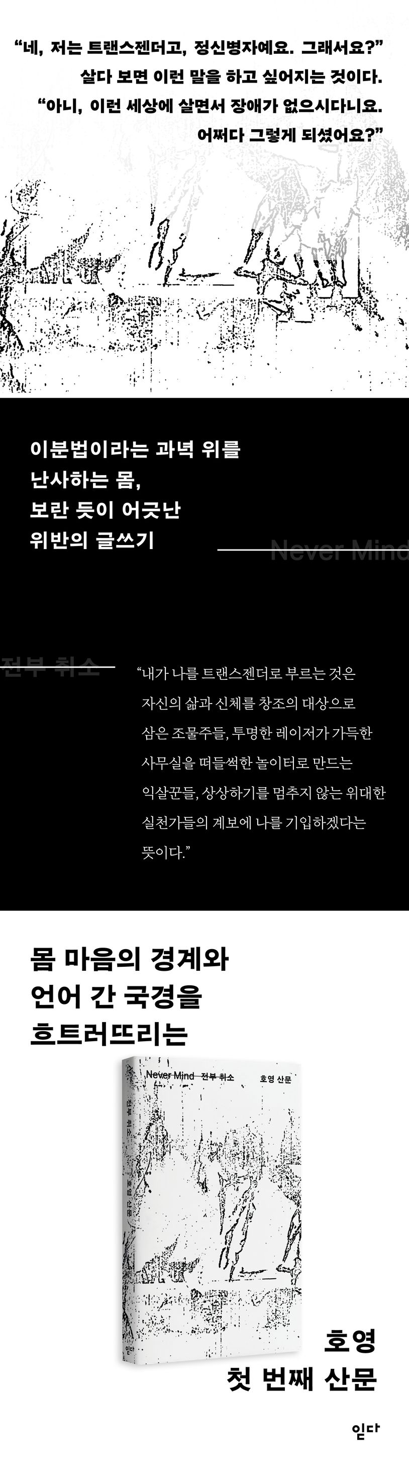은유 인터뷰집 《우리는 순수한 것을 생각했다》의 인터뷰이로, 《한편 11호: 플랫폼》의 필자로 한국문학 독자들에게 자신의 존재를 각인시켰던 한영 번역가 호영의 첫 산문이 읻다에서 출간되었다. 세상이 정해둔 이분법에 의구심을 품고 있는 사람이라면, 그 규범과 규준에 보란 듯 취소선을 그어버리는 호영의 글 서른네 편이 해독제가 되어줄 것이다.
