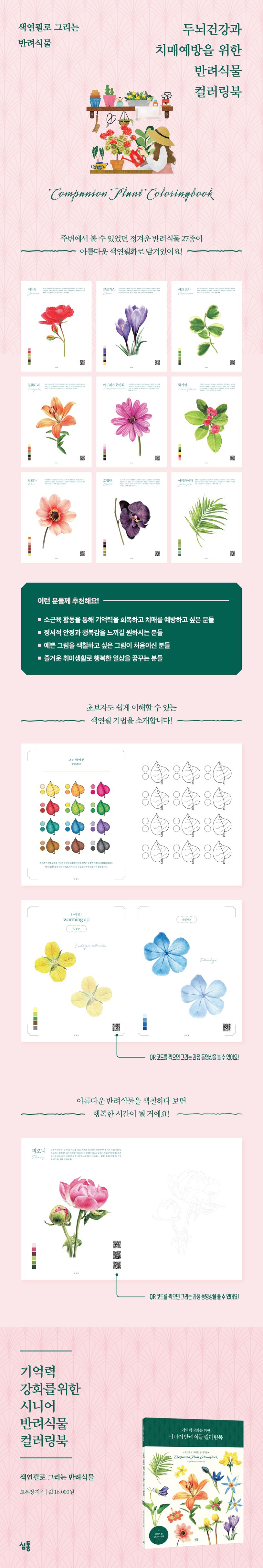 컬러링을 하면서 뇌의 노화도 늦출 수 있는 일석이조 홈 케어 컬러링북이다. 컬러링을 하면 근육 사용을 많이 할 수 있어 기억력이 강화될 수 있다. 반려식물을 채색하면서 느끼는 기쁨은 스트레스를 해소하고 정서적 안정과 행복을 선사하며 집중력도 향상된다. 즐거운 취미생활로 좀 더 행복한 일상을 꿈꿔보자.