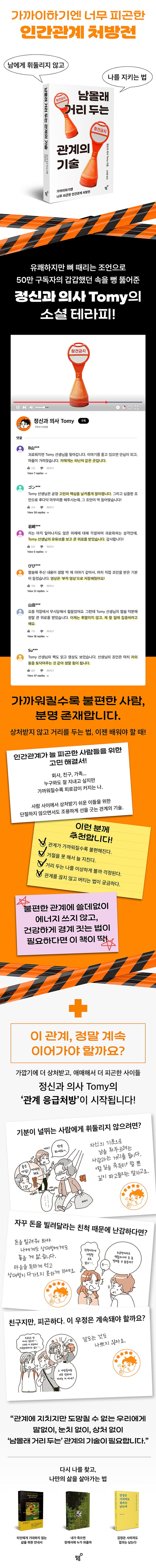 정신과 전문의이자 콘텐츠 크리에이터로 활동 중인 Tomy가 전하는 《남몰래 거리 두는 관계의 기술》은 다양한 관계 속에서 너무 멀어지지 않으면서도 감정적으로 소진되지 않는 ‘심리적 거리 조절 기술’을 알려준다. 정신과 의사 Tomy는 개인적인 경험과 전문적인 지식을 담은 상담을 전하다가 더 많은 이들에게 도움을 주고자 2019년부터 X(트위터)에 글을 올리기 시작했다, 이후 ‘정신과 의사 Tomy의 인생 클리닉’이라는 유튜브 채널을 운영하며 현실적인 조언과 친근한 말투로 50만 구독자의 갑갑했던 속을 뻥 뚫어주었고, 이 책에 그 모든 조언을 담아 화제가 되었다.
