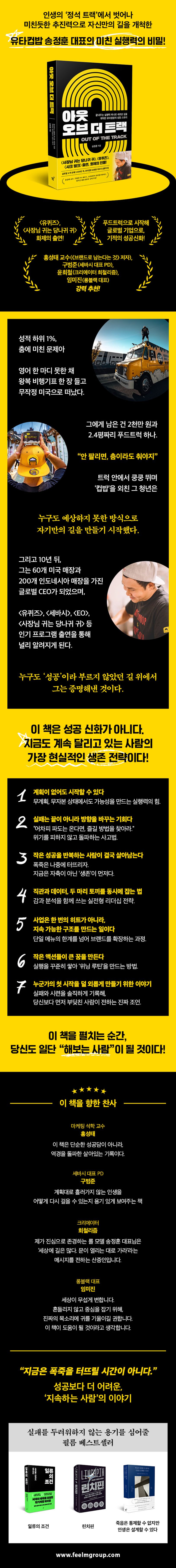 《아웃오브더트랙》은머리가아니라발로만든,분석이아니라실행으로증명한‘유타컵밥’이라는브랜드의모든과정을생생하게보여준다.유타주한복판에서한국식컵밥으로사람들을줄세우고그지역의문화가되기까지,그시작은단하나“한번해보자”는마음이었다.생생한진짜이야기가이책에담겨있다.이책은정해진길을따르지않아도충분히자신의길을만들수있으며,누군가가말하는“안된다”는말앞에서멈추지않고오늘을성실히살아낸사람이어떻게내일을바꿀수있는지를보여주는가장정직한한사람의이야기다.
