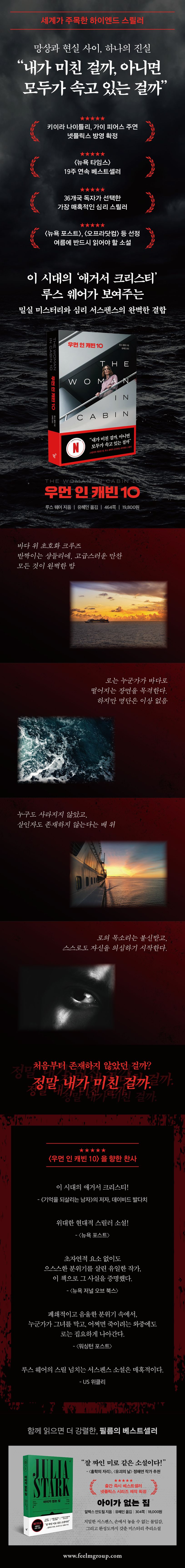 전 세계 스릴러 독자들이 열광한 루스 웨어의 대표작 《우먼 인 캐빈 10》이 드디어 출간된다. 이미 36개국에 출간되고, 뉴욕 타임스 19주 연속 베스트셀러에 오른 글로벌 스테디셀러인 《우먼 인 캐빈 10》은 출간 후 〈뉴욕포스트〉로부터 “여름에 반드시 읽어야 할 소설”로 선정되며 화제를 모았고, 오는 10월에는 키이라 나이틀리와 가이 피어스 주연의 넷플릭스 오리지널 영화 개봉까지 예정되어 있다.