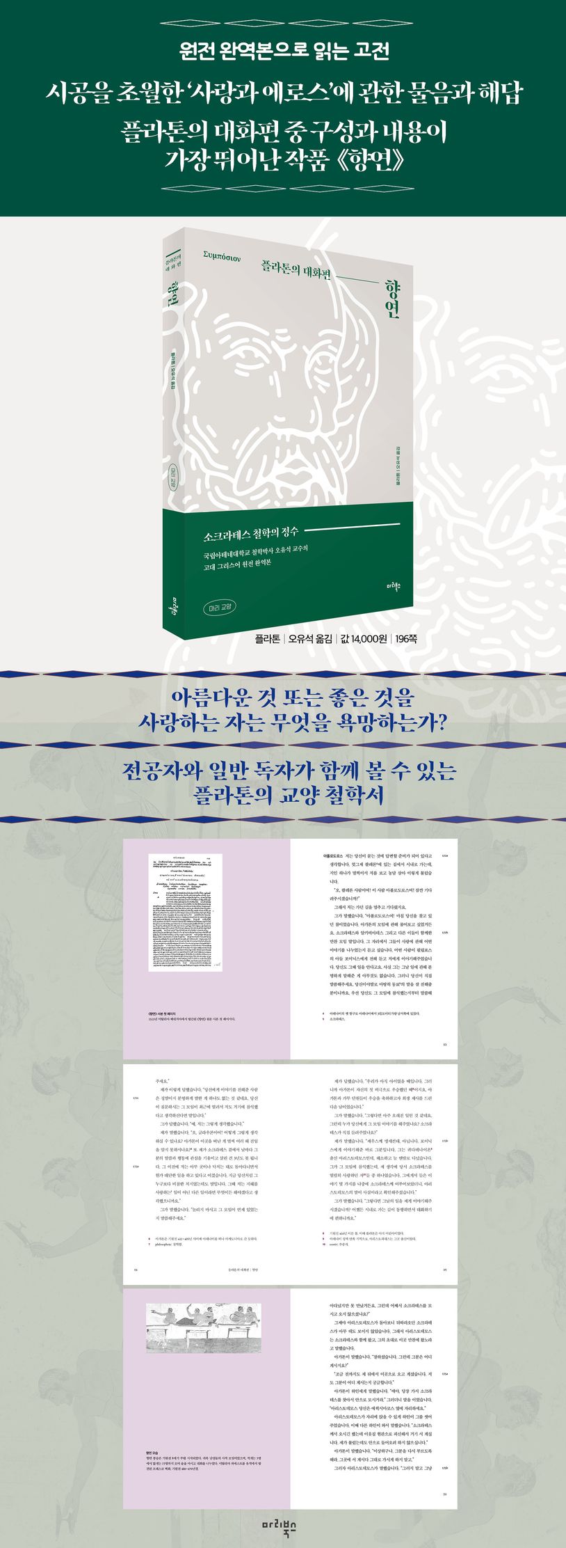 고대 그리스어 원전을 우리말로 옮기면서 무엇보다 신경 쓴 것은 상세한 각주와 깊이 있는 작품 해제다. 각주에서는 인명이나 지명, 역사적 사건 등을 꼼꼼하게 수록함으로써 내용을 더 잘 이해할 수 있도록 했다. 작품 해제에서는 단순한 내용 설명이 아닌 작품의 주요 배경, 플라톤의 ‘사랑’ 또는 ‘에로스’ 개념, 주요 내용 등을 수록함으로써 입체적으로 이해할 수 있게 했다. 플라톤 하면 일반 독자들은 물론 철학 전공자들도 언젠가는 독파해야 하는 커다란 산으로 여기고 있다. 이번 기회에 지금 언어로 쉽게 번역되었으면서도 철학의 학문적인 깊이를 더해주는 플라톤 철학서를 접해보는 것은 어떨까.