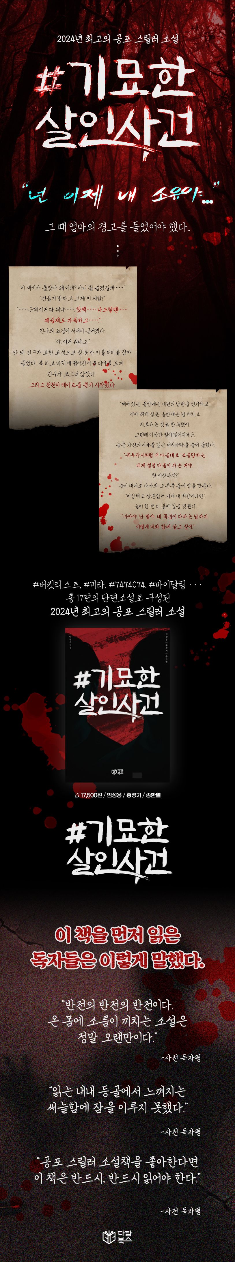 #1부버킷리스트|7미라|21소유|51남자친구의SNS|77#2부큰소리내지마세요|111아들이돌아오는날|123현관문너머|141널죽이러간다|1537474074|171형을집행한다|189#3부깊은산작은집|215어떤장례식|231마이달링|241붉은낙서|261일기|275의문의녹음|289자음레터|303
