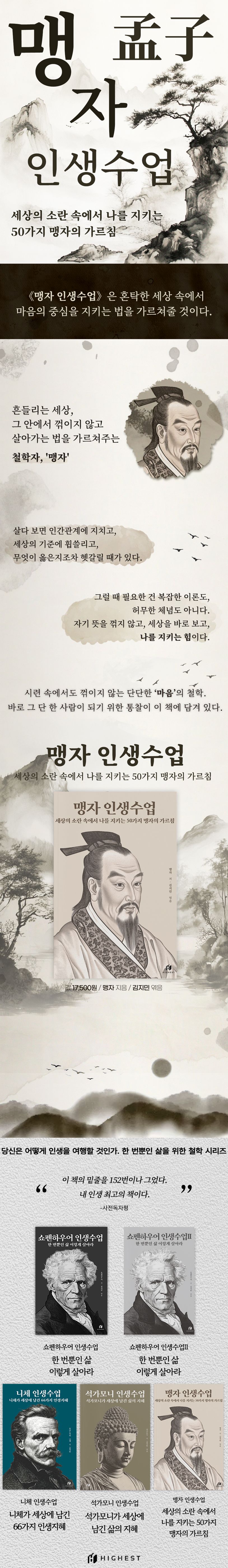 맹자의 『맹자 인생수업: 세상의 소란 속에서 나를 지키는 50가지 맹자의 가르침』은 〈자기 자신을 세우는 힘 (수양, 修養)〉, 〈함께 살아가는 힘 (공존, 共存)〉, 〈삶의 태도를 바르게 세우는 지혜 (처세, 處世)〉 등이 수록되어 있는 책이다.