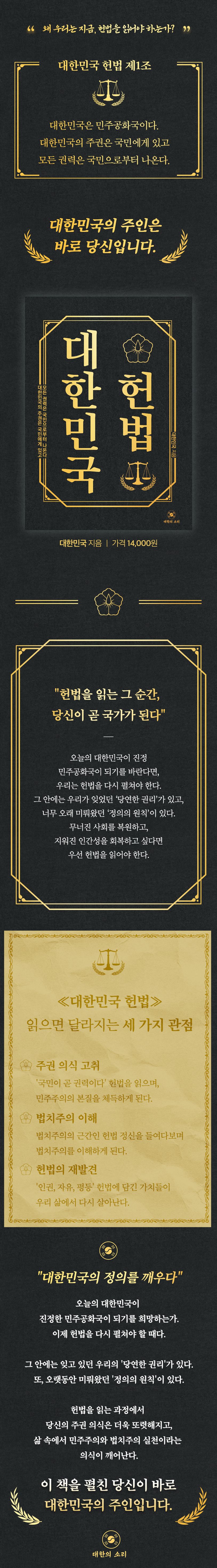 헌법은 바로 손에 닿아야 한다. 이 책은 대한민국 헌법 전문을 온전히 수록하고 작은 판형에 고급 금장 디자인으로 제작했다. 한 명의 대한민국 국민으로서 헌법을 언제든 꺼내 읽고 어디서든 생각할 수 있기를 바라는 마음을 담았다. 대한민국이 헌법 위에 서 있다면, 그 안에 사는 국민도 헌법을 품고 살아야 한다.