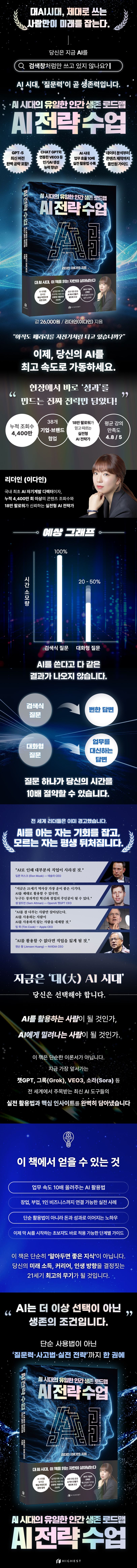 『AI 전략 수업』은 GPT-5 최신 업데이트를 포함해 챗GPT와 다양한 AI 활용법을 한 권에 담은 실전 가이드다. 삼성을 비롯한 38개 기업과 협업하며 AI 혁신을 이끌어 온 저자가, 기초 마인드셋부터 질문 설계, AI 모델 선택, 그리고 부록에 담은 250여 개의 일상 속 상황별 프롬프트까지 A부터 Z를 체계적으로 전수한다. 최신 기능과 활용법을 소개하면서도, AI 업데이트에도 변하지 않는 핵심 기본기인 질문법과 마인드셋을 함께 담았다. 이 책 한 권으로 최신 트렌드와 실전 노하우, 어떤 변화에도 흔들리지 않는 경쟁력을 모두 갖춘다.