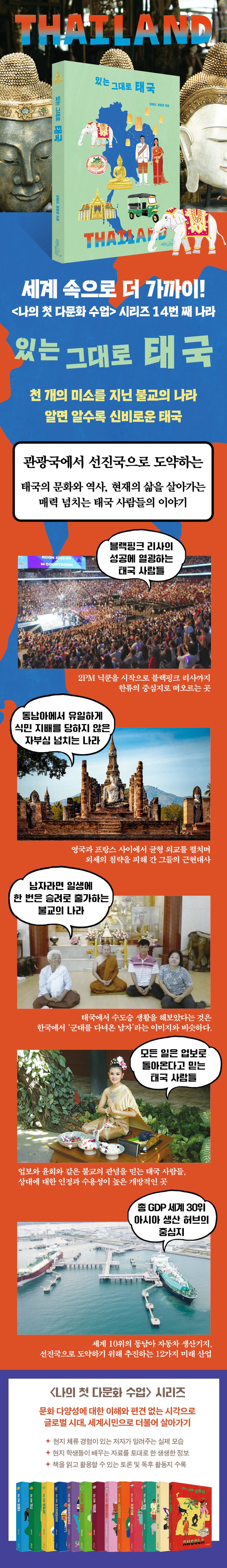 포스코 건설 태국 현지 주재원으로 8년간 생활한 강태규 저자와 글로벌 부서에서 일하면서 동남아시아 지역을 비롯한 여러 나라의 역사와 문화를 가르치는 정문훈 저자가 합심하여 쓴 이 책은 태국에서 꼭 가봐야 할 여행지에 관한 정보뿐만 아니라 매력적이며 흥미진진한 태국인의 생활 모습, 태국 사회 전반을 이해할 수 있는 태국의 역사와 문화까지 알면 알수록 신비함이 가득한 태국 이야기를 한 보따리 풀어낸다. 한국과는 다른 나라를 이해하려면 열린 마음과 조그마한 관심이면 충분하다. 이 책은 그 여정을 함께 할 것이다.
