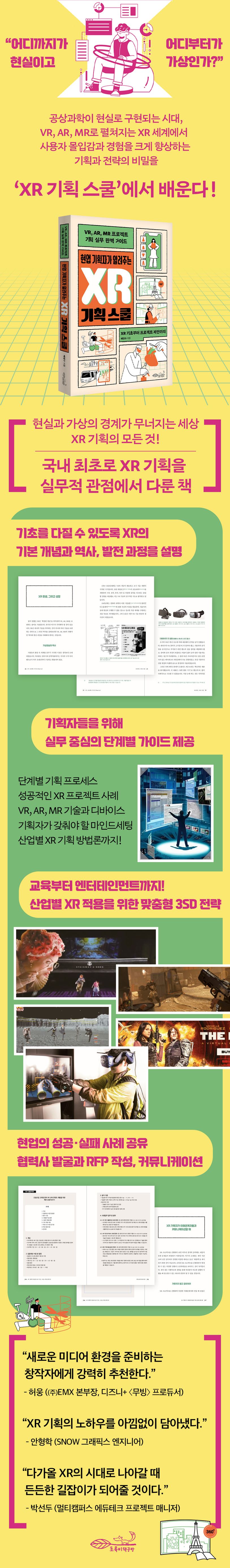 이 책은 XR 기획에 첫발을 내딛는 입문자부터, XR 기술을 이해하고 다양한 산업에서 이를 활용하고자 하는 실무자들에게까지 성공적인 XR 프로젝트를 위한 강력한 가이드가 될 것이다.