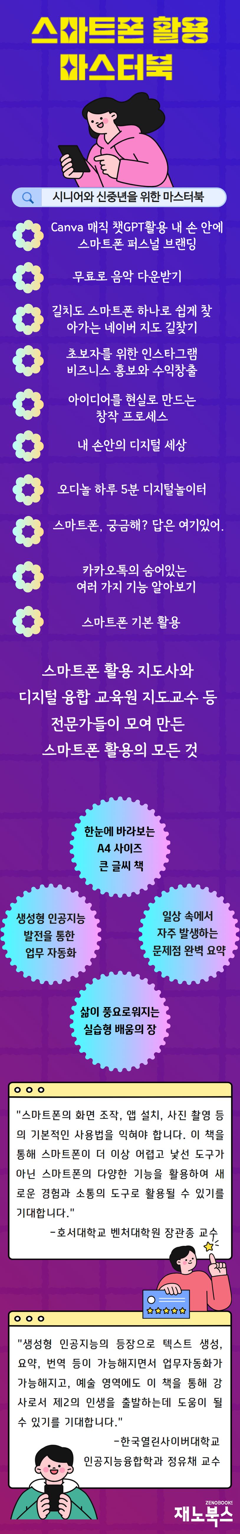 이 책은 시니어와 신중년층을 대상으로 스마트폰 활용 기술을 습득시키기 위해 제작된 책이다. 스마트폰의 화면 조작, 앱 설치, 사진 촬영 등의 기본적인 사용법부터, Canva, 챗GPT, 음악다운 앱, 네이버 지도, 인스타그램, 미리캔버스 등의 다양한 앱을 활용하는 방법까지 다루고 있다.