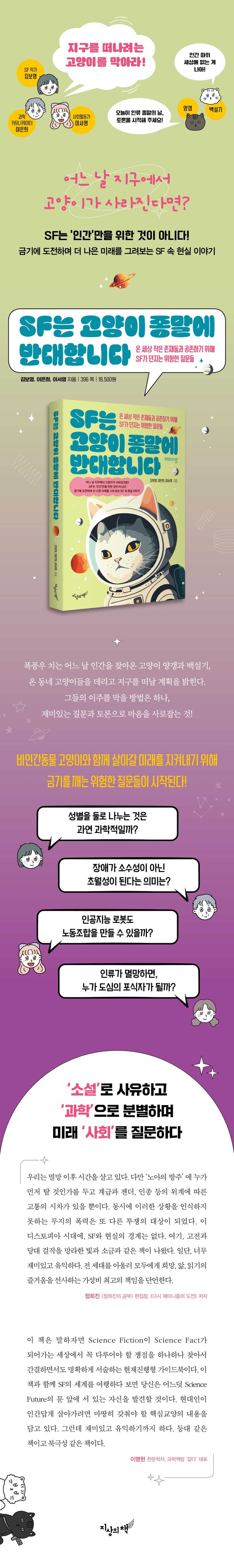 한국을 대표하는 SF 작가이자 가장 SF다운 SF를 쓰는 작가로 평가받는 김보영, 과학 커뮤니케이터 ‘하리하라’ 이은희, 작가이자 사회활동가인 이서영이 한자리에 모였다. 작중 각각 ‘신작가’, ‘노학자’, ‘한단결’로 캐릭터화된 이들에게 은밀히 주어진 임무는 인간에게 실망해 홀연 무리를 이끌고 지구를 떠나겠다 선언한 대장 고양이의 마음을 돌리는 일. 이 가상의 설정을 바탕으로, 세 작가가 SF를 둘러싼 독자들의 기상천외하고도 위험한 질문을 모아 논제를 함께 정하고, 매주 텔레그램에 모여 뜨거운 토론을 벌였다. 그리고 우리 시대의 이야기꾼 김보영이 재구성해 소설처럼 엮었다. 2019년 출간되어 올해의 청소년 도서로 선정되는 등 적잖은 반향을 일으킨 《SF는 인류 종말에 반대합니다》(지상의책)의 후속편 기획으로, 전편에서 ‘인류를 구할 답’을 찾고자 했다면 《SF는 고양이 종말에 반대합니다》에서는 인간을 넘어 ‘비인간’이라 칭해지는 다양한 존재와 공존하는 삶을 모색한다.