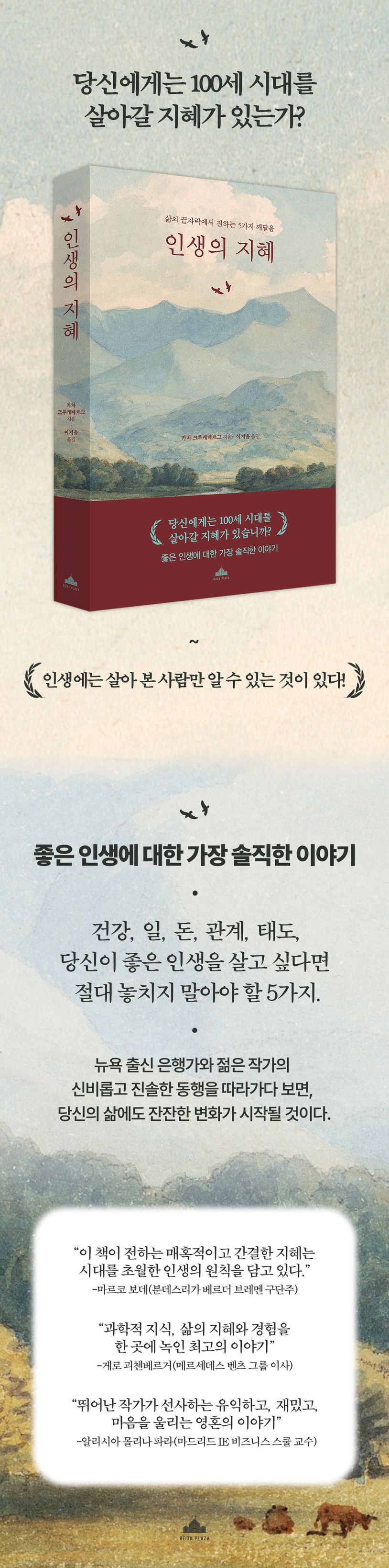 누구나 100살을 사는 시대가 왔다. 그러나 기나긴 수명의 축복을 제대로 알고 삶을 가꾸어 나가는 사람은 드물다. 이것이 그 어느 때보다 우리에게 인생의 지혜가 필요한 이유다. 좋은 인생을 살 준비가 되었는가? 뉴욕 출신의 은퇴한 은행가와 젊은 작가의 신비롭고 진솔한 동행을 따라가다 보면, 어느 순간 당신의 삶에도 잔잔한 변화가 시작될 것이다.