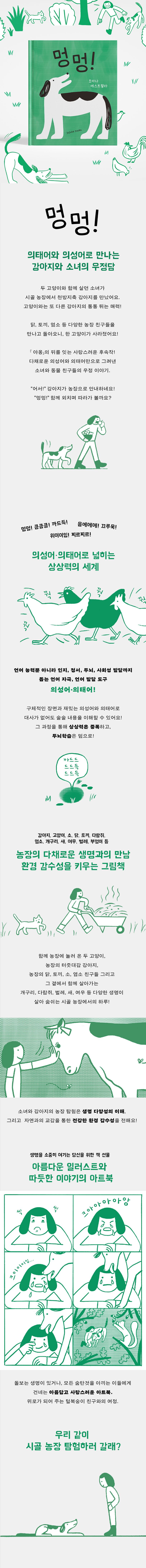 독자의 마음을 사로잡았던 의성어·의태어 그림책 『야옹』의 후속작, 그림책 『멍멍』이 출간된다. 『멍멍』은 소녀와 강아지의 씩씩하고 발랄한 시골 농장 탐험을 통해 자연의 소중함과 다채로운 생명의 아름다움을 더욱 풍성해진 의성어와 의태어로 전한다.
