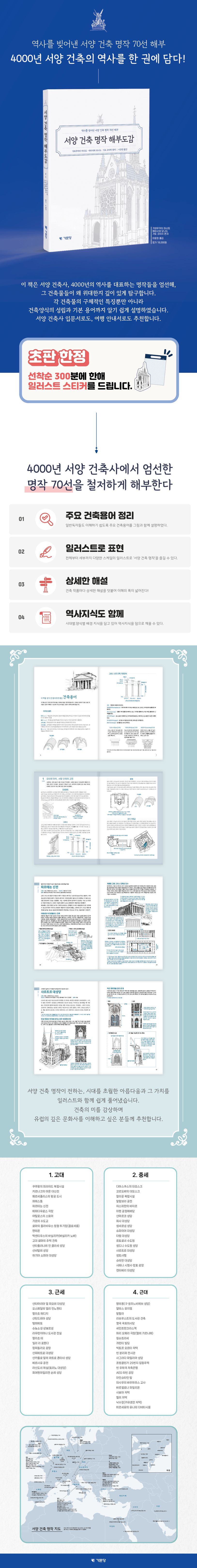 이 책은 고대부터 근대까지의 서양 건축물 중 명작(Masterpiece)을 선정하여, 각 작품의 전체와 세부 특색을 일러스트(그림)와 문장(글)으로 해설하는 ‘해부 도감’ 시리즈의한 권입니다. 총 70개의 명작을 엄선하였습니다.