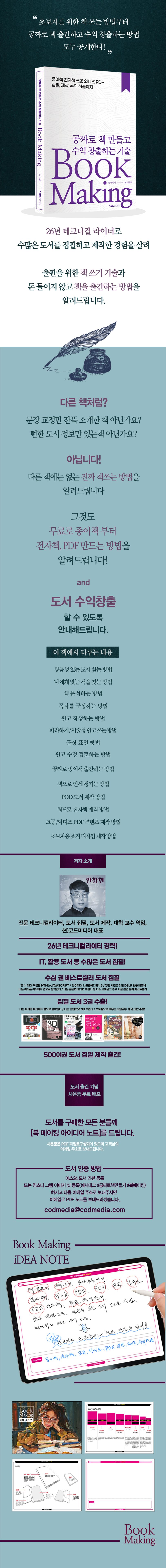 26년 테크닉컬 라이터 저자가 그동안 수많은 도서를 집필 제작한 노하우를 담아 초보자를 위한 책 쓰는 방법부터 공짜로 책 출간하고 수익 창출하는 방법을 소개합니다. 종이책부터 전자책부터 요즘에 각광 받고 있는 크몽, 와디즈 PDF 도서까지 다뤄 모든 도서를 총체적으로 다루고 있으며 어디에서도 공개되지 않은 현실적인 출판 이야기를 소개하고 있습니다. 도서 내용은 도서 출간 이론, 도서의 핵심인 목차 구성, 원고 집필 요령, 원고 검토, 무료 도서 출간으로 총 5개의 장으로 나누어 초보자도 쉽게 도서를 제작할 수 있도록 안내합니다. 처음 원고 집필을 준비하거나 도서를 출간하려는 분들에게 어떻게 준비해야 하는지 알려주는 길라잡이가 될 것입니다.