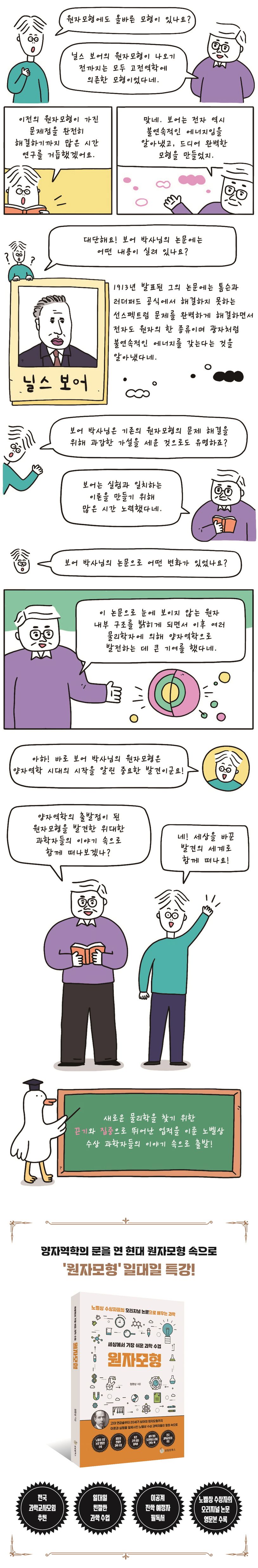 〈노벨상 수상자들의 오리지널 논문으로 배우는 과학 시리즈〉 중의 4권인 《세상에서 가장 쉬운 과학 수업 원자모형》은 고전 물리학으로 설명할 수 없는 현상이 존재할 수 있다는 사실을 보여준 중요한 사건을 다룬다. 따라서 보어의 원자모형은 양자물리학으로 한 발짝 더 다가가는 중요한 나침반이 되었다. 이 책에서는 고대 원소론부터 양자역학으로 발전하기까지 역사적인 흐름으로 흥미진진하게 풀었다. 더불어 톰슨, 러더퍼드, 보어의 오리지널 영어 논문을 통해 그 시대 속 물리학자들의 고심과 연구 결과를 생생하게 느낄 수 있다. 이 책에는 위대한 발견을 한 과학자들의 에피소드와 함께 수식이 등장한다. 어렵다고 느낄 필요 없이 고등학교 수준의 수학 내용만 알면 이해할 수 있도록 친절하게 설명하고 있다. 정교수와 물리군의 일대일 대화를 따라가다 보면 수학이나 과학에 두려움이 있는 독자들도 쉽게 이해할 수 있게 될 것이다. 이 책은 시리즈(전 20권)로 기획되었으며 역대 노벨 물리학상 수상자들이 모두 등장한다.