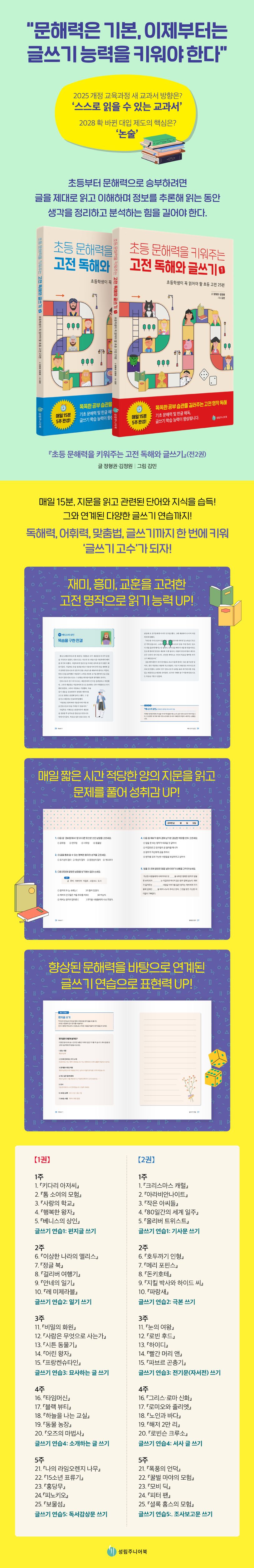 『초등 문해력을 키워주는 고전 독해와 글쓰기』(전2권)는 초·중·고 교과서에서 빈번하게 다뤄지는 고전 명작 50편을 선별해 각각 중요 장면들로 지문을 구성했다. 길지 않은 지문은 읽는 데 부담이 없고 그에 따른 적당한 문제를 풀게 해 주어진 지문을 완전하게 독해할 수 있도록 쉽고 재미있게 풀어냈다. 또한 읽은 지문과 연계한 글쓰기로 표현력이 향상되어 잘 읽는 것을 넘어 자신의 경험과 생각을 글로 쓰는 힘을 기를 수 있다.