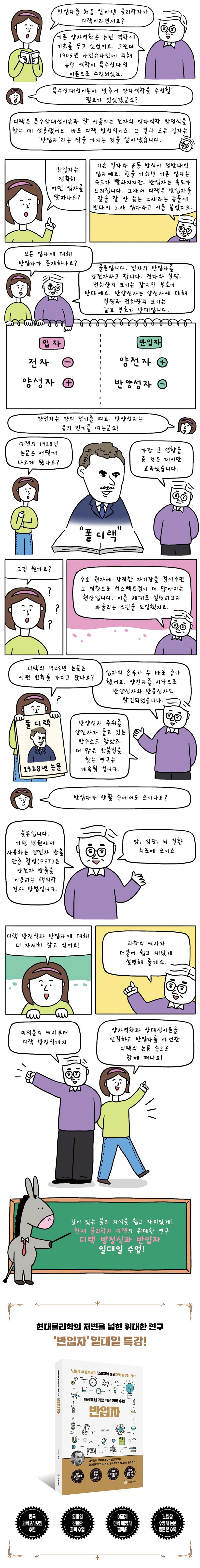《세상에서 가장 쉬운 과학 수업 반입자》는 디랙의 1928년 논문이 완성되기까지, 그 배경지식이 되는 이론들과 논문 해설, 이후 발전 상황을 정교수와 물리군의 일대일 대화 형식으로 재미있게 설명한다. 이론을 발전시켜온 여러 과학자들의 숨겨진 에피소드도 함께 소개한다. 특히 5장에서 새로운 입자에 대한 가설을 세우고 용어를 만들고 추론하고 반박하는 일련의 과정은 매우 흥미롭게 전개된다. 이 책에는 논문을 읽는 데 필요한 수학식이 계속해서 등장하기에 난해하다고 느낄 수 있지만, 그만큼 이론을 알차고 심도 있게 다룬다.