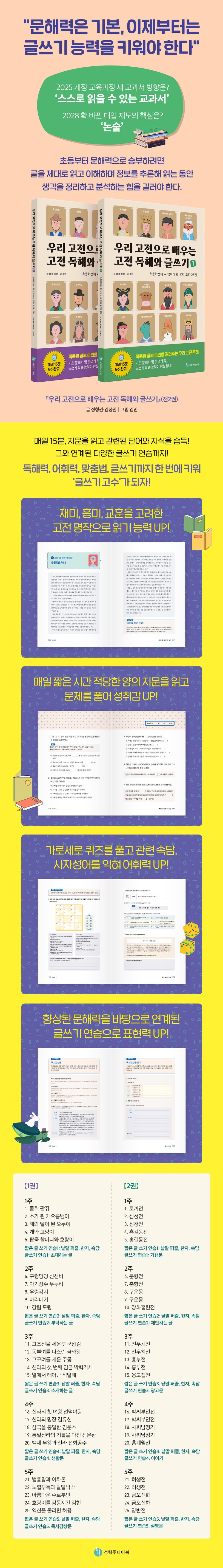 『우리 고전으로 배우는 고전 독해와 글쓰기』(전2권)는 초·중·고 교과서에서 빈번하게 다뤄지는 우리 고전 50편을 선별해 각각 중요 장면들로 지문을 구성했다. 길지 않은 지문은 읽는 데 부담이 없고 그에 따른 적당한 문제를 풀게 해 주어진 지문을 완전하게 독해할 수 있도록 쉽고 재미있게 풀어냈다. 또한 읽은 지문과 연계한 글쓰기로 표현력이 향상되어 잘 읽는 것을 넘어 자신의 경험과 생각을 글로 쓰는 힘을 기를 수 있다.