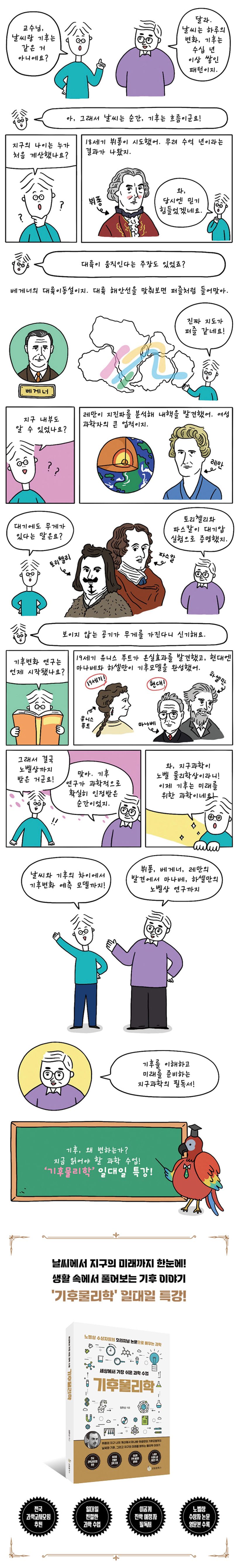 추천사천재과학자들의오리지널논문을이해하게되길바라며기후를통계물리학으로다룬하셀만_복잡계연구로노벨물리학상받은파리시박사깜짝인터뷰첫번째만남_지질학의탄생과진화지질학의뿌리를찾아서_고대그리스에서시작된지구이야기지구의비밀을풀다_중세와르네상스지질학자들의여정지층에새겨진지구의연대기_스테노와지층누중의법칙지구는몇살일까?_지구의나이를계산한뷔퐁지구의기원을물에서찾다_베르너의수성론지구는끓고있다_화성론과허턴의동일과정설두번째만남_지구의퍼즐을맞춘사람들대륙은움직인다_베게너와대륙이동설의탄생판게아를상상한사람들_대륙이동설의기원을찾아서드러나는지구속_지진파를발견한과학자들지구내부를가르다_불연속면을발견한과학자들지구의심장을발견하다_내핵을밝혀낸잉게레만지구는퍼즐이다_판구조론으로보는지구의비밀세번째만남_기상학,날씨를과학으로담다하늘을읽은철학자들_고대그리스의기상학안티크톤에서구름까지_중세기상학의여정공기의무게를측정하다_토리첼리와대기압의발견공기의무게를증명하다_파스칼과괴리케의대기압실험구름너머의진실_알프스를오른대기과학의선구자소쉬르구름에이름을붙이다_하워드가본하늘의질서뜨거워지는도시,흐려지는하늘_열섬과스모그현상네번째만남_대기권발견과구름위의과학자들구름위로간사람들_열기구와대기과학의탄생하늘을나눈선_성층권발견이야기보이지않는하늘의경계선들_오존층에서열권까지하늘은왜층층이나뉠까?_대기권의과학적구조다섯번째만남_기상학의역사와그선구자들눈에보이는바람의언어_보퍼트,바람을분류하다신의분노에서과학적예측으로_태풍연구의역사날씨를읽는과학의탄생_일기예보의역사현대기상학의뿌리를찾아서_일기예보의아버지피츠로이여섯번째만남_불확실성속의과학,하셀만의논문속으로비는쟁기를따를까?_기후변화에대한인식의변천사빙하가남긴흔적_루이아가시와빙하기이론의탄생열을가두는공기의정체_온실효과의과학적기원온실효과의숨겨진선구자_유니스푸트의빛나는발견기후변화를물리학으로예측하다_마나베와기후모델실험기후를확률로예측하다_하셀만이밝힌불확실성속의질서만남에덧붙여ThermalEquilibriumoftheAtmospherewithaGivenDistributionofRelativeHumidity_마나베논문영문본StochasticClimateModelsPartI.Theory_하셀만논문영문본위대한논문과의만남을마무리하며이책을위해참고한책과논문들수식에사용하는그리스문자노벨물리학상수상자들을소개합니다