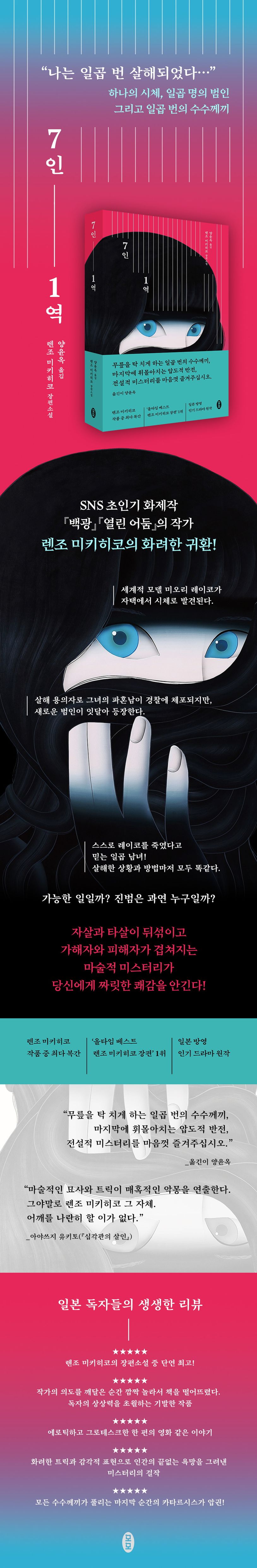《백광》과 《열린 어둠》으로 독자들을 충격과 황홀경에 빠뜨렸던 격조 높은 미스터리의 제왕 렌조 미키히코가 돌아왔다! 장편소설 《7인 1역》은 1984년 일본에서 초판 출간 이후 40여년이 지난 지금까지 여러 차례 복간이 이어져 ‘불사조 미스터리’라는 별칭을 얻은 작품으로 국내에서는 모모에서 최초 출간되었다.
