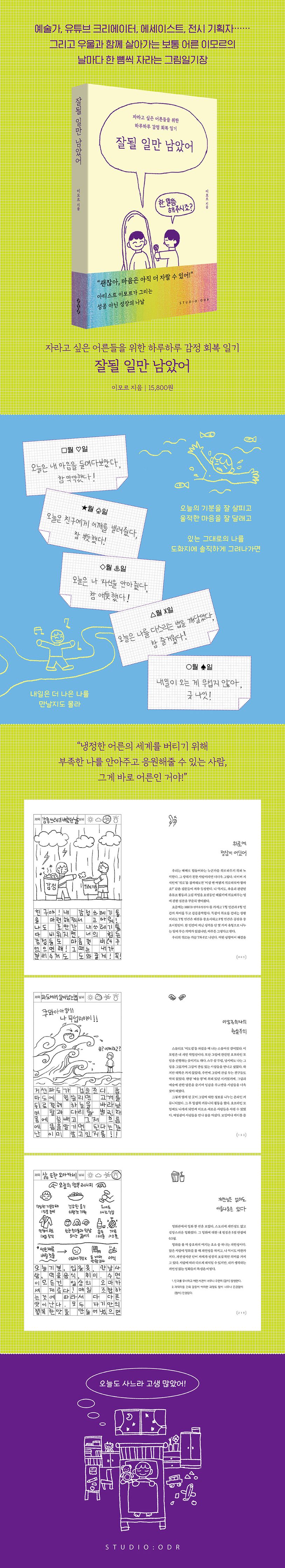항상 인터뷰어로서 다양한 사람들을 만나 상처를 대면하도록 돕던 그가 이번 책에서는 자기 자신의 내면에 귀를 기울인다. 이모르는 《잘될 일만 남았어》에서 마치 대여섯 살 어린아이가 그린 듯한 그림으로 ‘어른판’ 그림일기의 세계를 펼쳐 보인다. 조금만 방심하면 비집고 들어와 마음을 흩트리는 과거의 트라우마를 극복하고, 십여 년도 넘게 자신을 괴롭히던 우울증에서 벗어나고, 복잡한 인간관계와 여러 현실적인 고민들에서 오는 스트레스에 잠식되지 않게 스스로 보살피고, 북돋운다. 자신을 일으켜 세우는 그 지난한 감정 회복의 여정을 함께하다 보면 독자 여러분도 이전과는 달라진 나, 자신에게 좀 더 너그러워진 나를 발견할 수 있을 것이다.