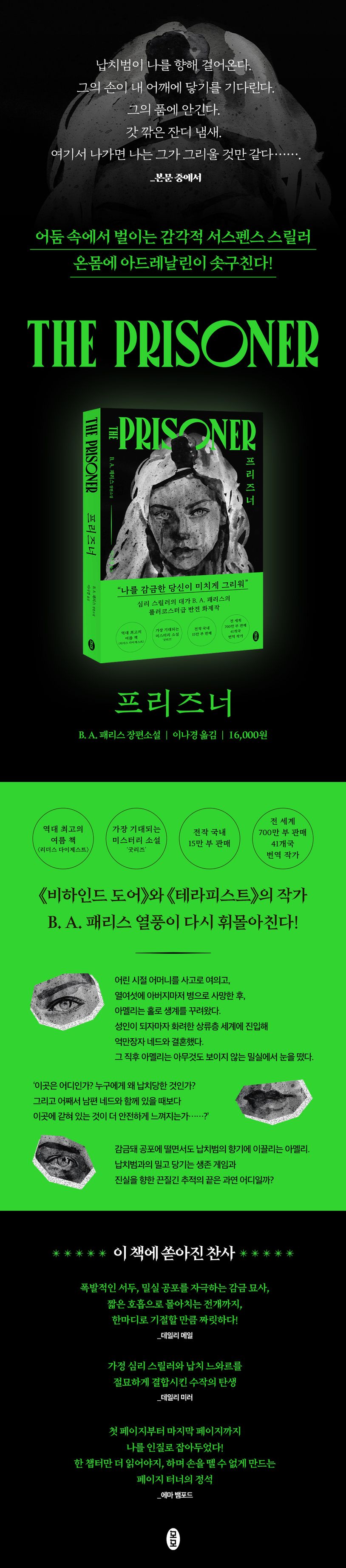 ‘평온한 일상을 훅 치고 들어오는 낯선 공포’라는 설정으로 한번 책장을 열면 절대 멈출 수 없는 페이지 터너의 정석을 선보여온 작가는 이번 《프리즈너》에서도 특유의 솜씨를 여지없이 뽐낸다. 주인공 아멜리는 행복을 보장하는 결혼 생활을 시작하자마자 시간적, 공간적 감각을 완전히 차단당한 채 낯선 곳에 갇힌다. 이렇듯 시작부터 급강하하는 롤러코스터에 탄 것처럼 짜릿한 스릴을 선사하는 《프리즈너》는 독자들을 매료시킬 ‘역대 최고의 여름 책’(〈리더스 다이제스트〉)이자 ‘가장 기대되는 미스터리 소설’(‘굿리즈’)임에 틀림없다.
