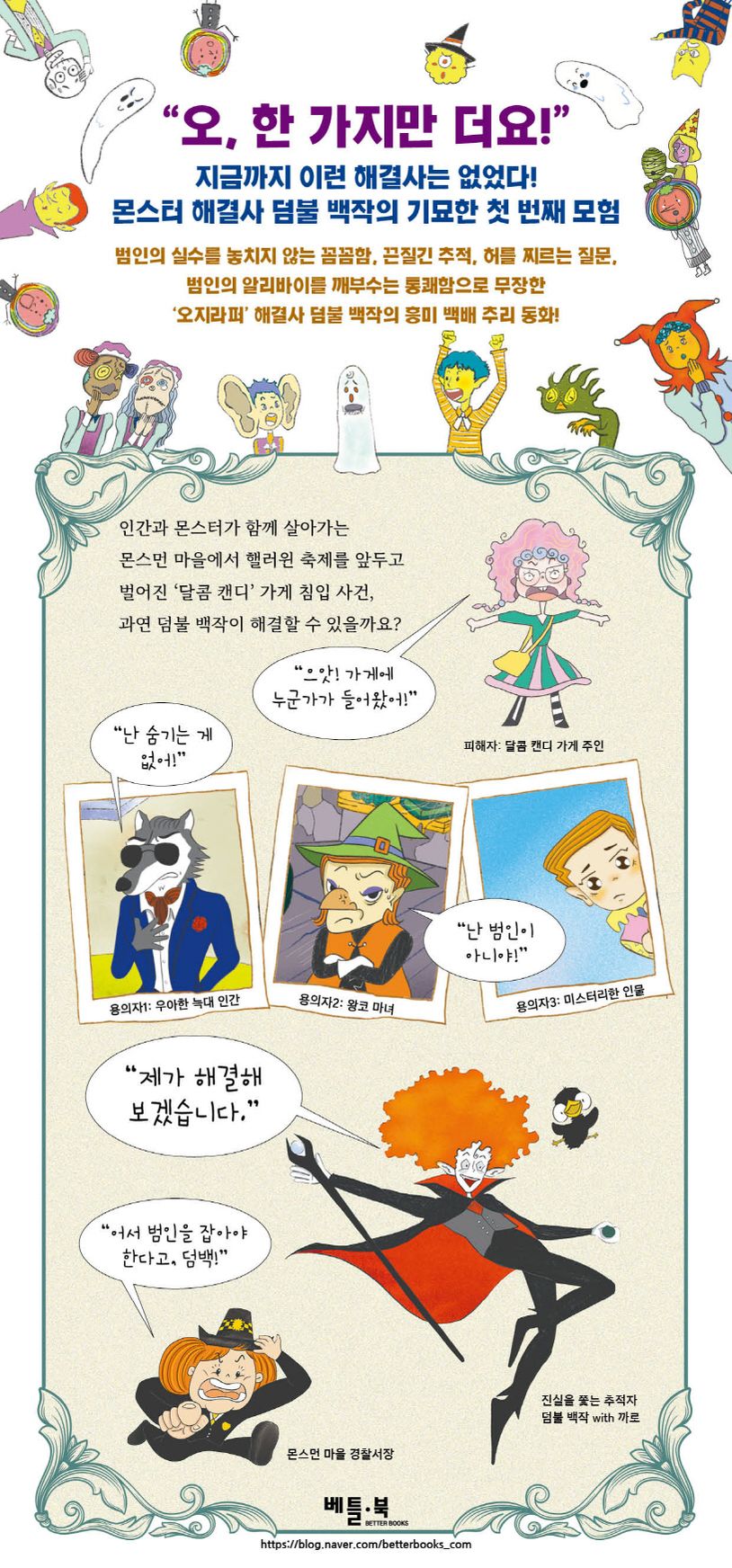 사람과 몬스터가 어울려 사는 몬스먼 마을. 몬스먼 마을에서는 누구라도 환영합니다. 이곳에서 희한하거나 신기하거나 알송달쏭한 일이 벌어지면 어김없이 나타나는 ‘오지라퍼’ 해결사 덤불 백작! 핼러윈 축제를 앞두고 몬스먼 마을에서 가장 크고 유명한 ‘달콤 캔디’ 가게에 누군가 침입하는 사건이 발생합니다. 사탕을 사 먹은 아이들이 지독한 콧물과 재채기에 시달리며 아프기 시작하지요. 범인은 누구일까요? 왜 그런 일을 저질렀을까요? 무엇보다 과연 덤불 백작이 해결할 수 있을까요? 몬스터 해결사 덤불 백작의 첫 번째 이야기 지금, 시작합니다!