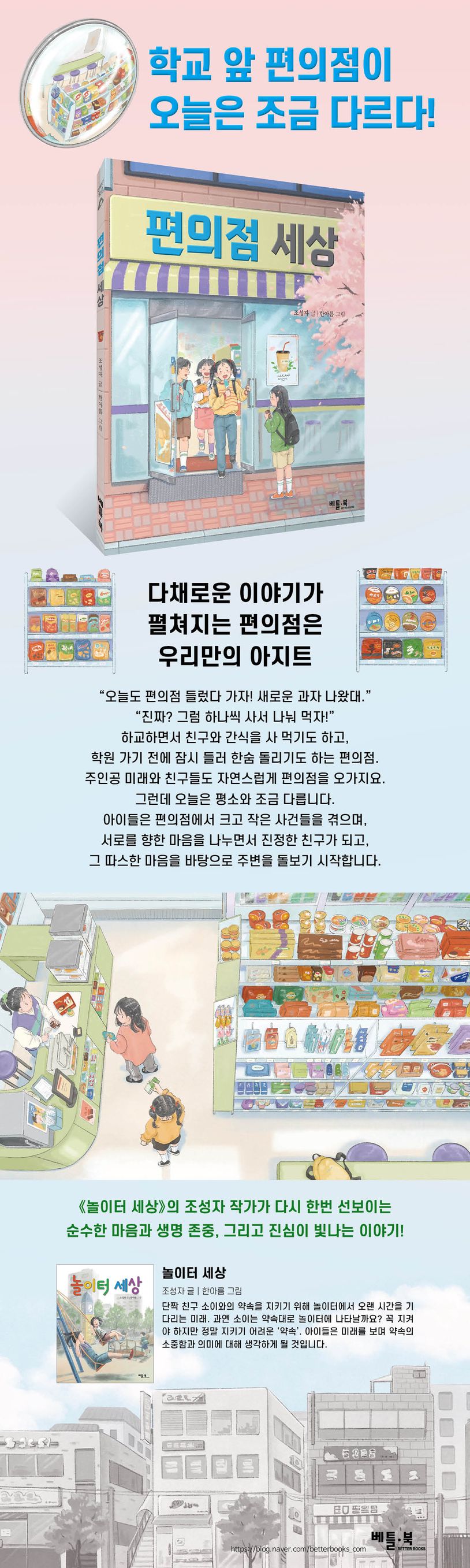 학교 앞 편의점은 아이들에게 무척이나 익숙한 장소입니다. 하교하면서 친구와 간식을 사 먹기도 하고, 학원 가기 전에 잠시 들러 한숨 돌리기도 합니다. 이 책의 주인공 미래도 단짝 친구 소이와 함께 편의점에 가서 컵라면을 사 먹기로 합니다. 그런데 친구 리암이가 소이에게 할 말이 있다고 하자, 미래는 먼저 편의점에 가 있기로 하지요. 금방 나타날 줄 알았던 소이는 시간이 꽤 지나도 보이지를 않는데……. 미래에게 어떤 일이 생길까요? 몸과 마음을 촉촉하게 적셔 주는 사막의 오아시스 같은, 요즘 아이들의 아지트인 편의점을 배경으로 벌어지는 소소하지만 애달프고도 따스한 이야기를 만나 보세요.