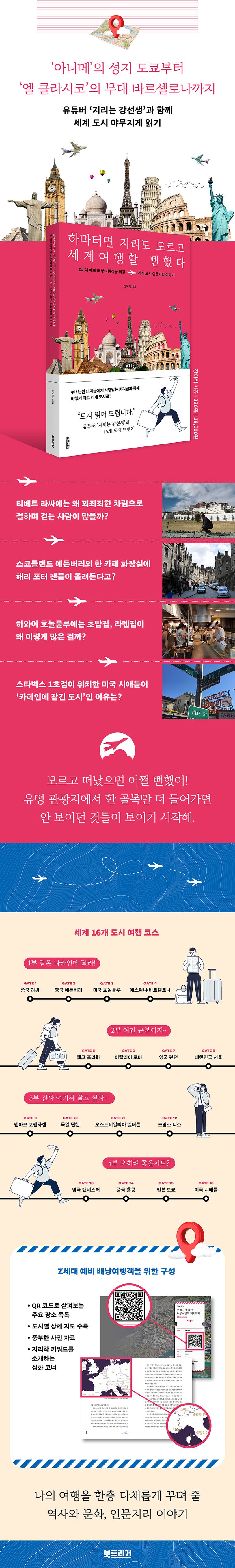『하마터면 지리도 모르고 세계여행할 뻔했다』는 20대를 세계여행에 바친 지리 선생님이 청소년과 예비 배낭여행객을 위해 준비한 낭만 가득 인문 여행기다. 지리·경제·역사·문화 등 세계 각지 16개 도시가 품고 있는 이야기를 직접 경험한 에피소드와 버무려 생생하게 들려주며 풍부한 배경지식과 함께 독자의 가슴속에 여행의 꿈을 심는다.