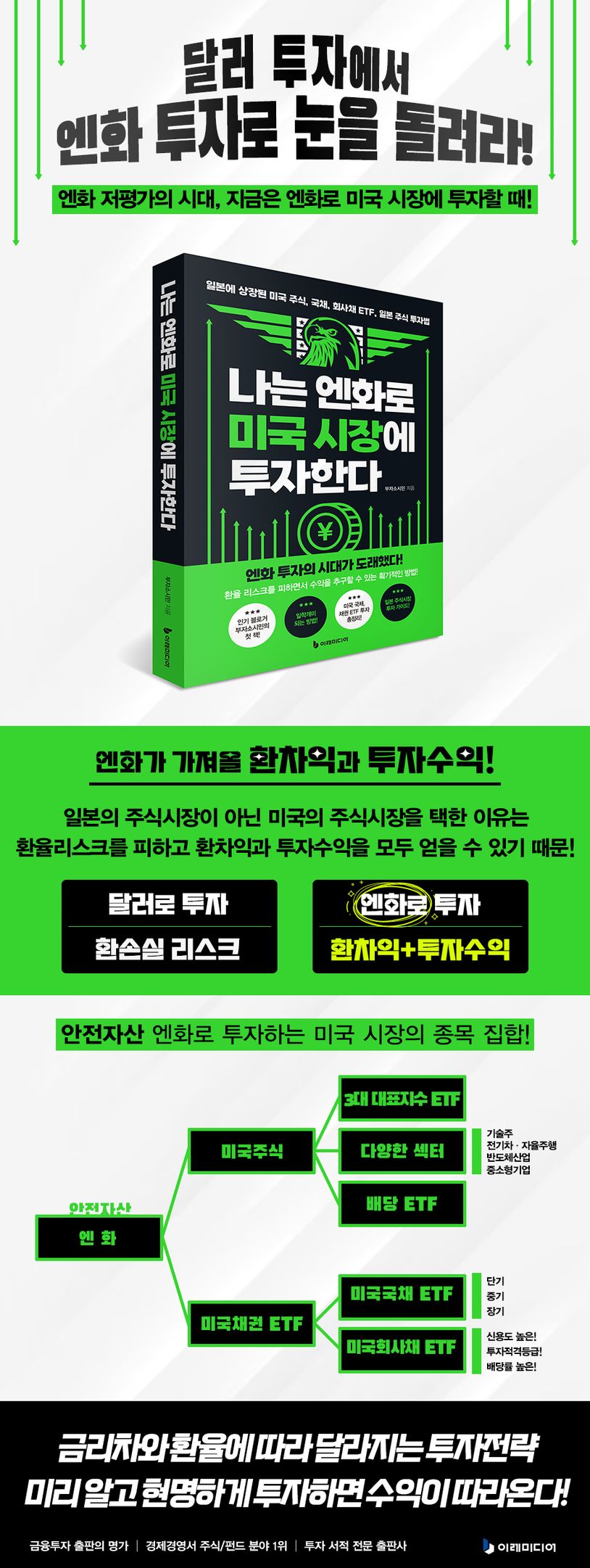 엔화 환율이 이례적인 지금, 달러의 하락 리스크는 피하고 상대적으로 저평가되고 안정적인 엔화로 미국 시장에 투자해서 수익을 거두는 방법을 소개하는 책이다. 왜 엔화인가에 대한 상세한 설명과 함께 미국의 3대 대표지수부터 반도체, 자율주행 등 기술주, 배당주, 미국의 국채와 회사채 그리고 일본 주식에 대한 투자 소개가 알차게 이루어져 있다.