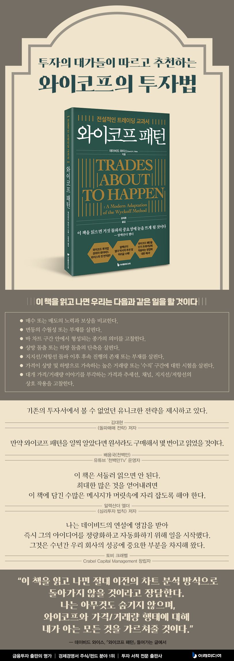 《와이코프 패턴》은 기술적 분석의 선구자인 와이코프의 트레이딩법을 재해석한 책이다. 공자는 “진정한 스승은 오래된 것을 되살려서 새것을 알려주는 사람”이라고 했는데, 데이비드 와이스가 여기에 들어맞는다. 저자인 데이비드 와이스는 와이코프의 강좌와 투자서뿐만 아니라 그의 이론으로 강의하는 유명 강사 밥 에번스의 비유도 가져와 이 책에 녹여낸다. 즉 와이코프와 와이코프 패턴을 심도 있게 분석한 사람의 개념을 가져와 현대적 토대에 결합시키는 역할을 데이비드 와이스가 자처한 것이다.