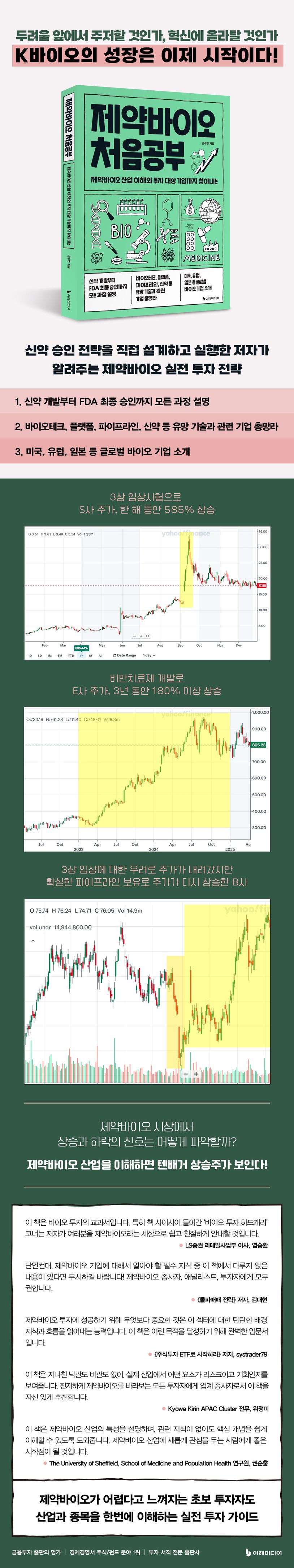 제약바이오 업계에 오랫동안 몸담아 온 저자는 풍부한 경험을 토대로 빠르게 변화하는 제약바이오 산업의 특징과 주가 변동 요인을 데이터 분석을 통해 객관적으로 설명한다. 지나치게 긍정적이거나 비관적인 시각을 배제하고, 어떤 요소가 위험이고 기회인지를 균형 있게 제시한다. 《제약바이오 처음공부》는 비이성적인 판단을 배제하고 냉철한 시각으로 투자 결정을 내리고 싶은 투자자에게 적격인 책이다.