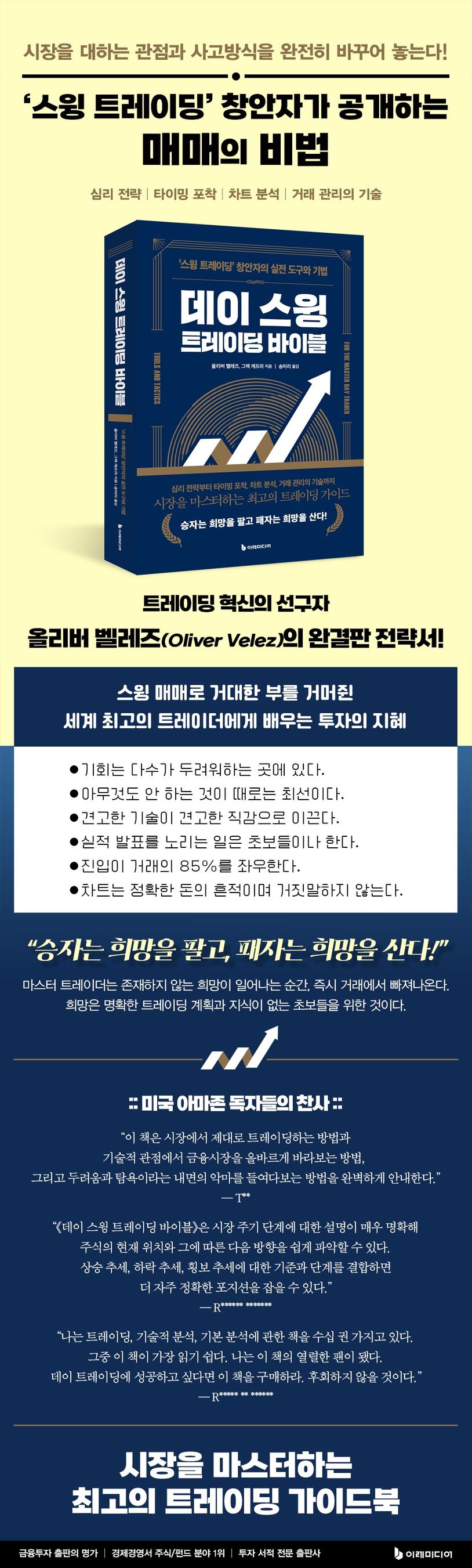 자고 일어나면 바뀌어 있을 정도로 격변을 거듭하는 게 주식 시장이다. 저자 올리버 벨레즈(Oliver Velez)와 그렉 캐프라(Greg Capra)는 이런 주식 시장에서 30년이 넘는 시간 동안 성공적인 트레이딩으로 부와 명성을 일궈냈다. 아울러 올리버 벨레즈는 ‘스윙 트레이딩’ 개념을 최초로 창안함으로써 혁신을 주도해 업계에 돌풍을 일으켰으며 수많은 트레이더 지망생을 교육해온 트레이딩의 선구자다. 《데이 스윙 트레이딩 바이블》은 이 두 저자가 시장을 통찰하고 주도면밀하게 대처하는 핵심 방법과 개념을 상세하고 일목요연하게 소개한 책이다. 모든 종류의 주식 시장에서 효과적으로 사용할 수 있는 검증된 수익 전략, 트레이딩 고수가 되기 위해 노력하는 사람들을 위한 실전 기법 중심의 유용한 조언들이 가득하다. 데이 트레이더뿐 아니라 어떤 방법으로든 주식을 접하는 모든 사람이 꼭 읽고 숙지해야 하는 불변의 진리를 담은 책이다.