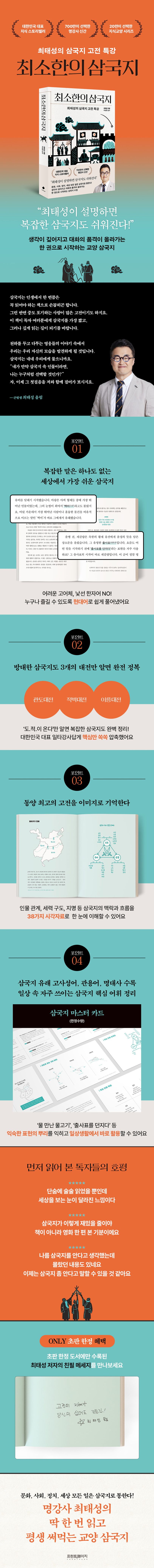 ‘삼국지, 한번은 읽어봐야 한다는데 왜 이렇게 길고 등장인물이 많아?’ 삼국지를 선뜻 시작하지 못하는 사람들의 부담감을 덜고, 동양 최고의 고전에 담긴 지혜와 통찰을 쉽고 재미있게 나누기 위해 누적 수강생 700만 명에 이르는 명강사 최태성이 나섰다. 꼭 알아야 할 핵심만 한 권에 담아 누구나 단숨에 이해할 수 있는 삼국지 입문서 《최소한의 삼국지》가 탄생했다.