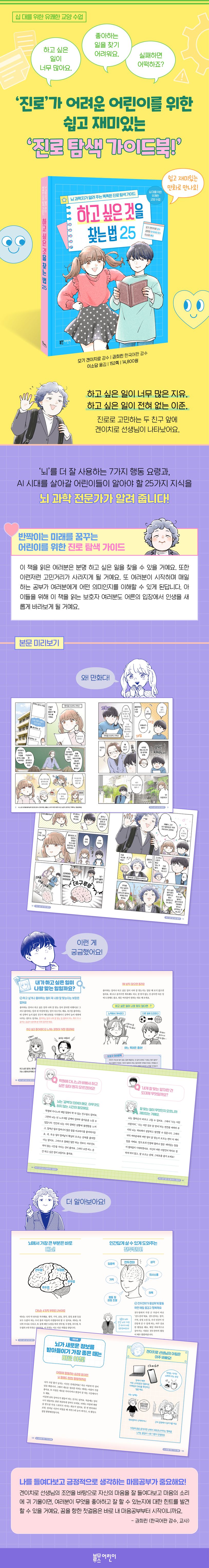 이 책은 ‘일’이란 무엇인지에 대한 근본적인 궁금증부터, 어린이들이 ‘하고 싶은 일’을 정하고 목표를 향해 달려 나가는 과정에서 겪는 수많은 고민과 걱정 25가지를 명쾌하게 풀어 줍니다. ‘열심히 하면 돼!’라는 막연한 말이 아닌, 뇌 과학에 근거한 명쾌한 답변을 통해서, 우리 어린이들이 어떤 생각과 마음으로 미래를 향해 달려 나가야 하는지를 알려 주고 있어요. ‘뇌’를 더 잘 사용하고 발달시키기 위한 7가지 행동 요령과, 더 나아가 AI 시대를 살아갈 어린이들이 알아야 할 지식과 갖춰야 할 마음가짐도 단단히 짚어 줍니다.