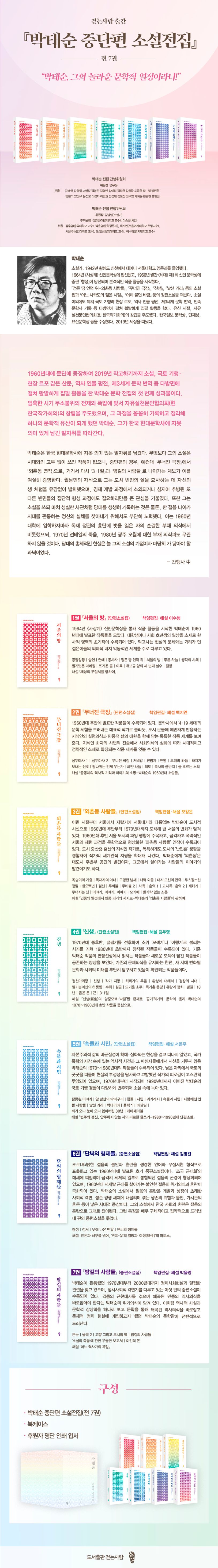 이번 전집에는 그동안 거의 언급되지 않았던 작품들까지 포함해 박태순의 중·단편 소설 작품이 고루 수록되어 있다. 1권은 대학생이나 사회 초년생의 일상을 소재로 한 사적 영역의 초기작인 『서울의 방』 (단편), 2권은 지식인의 실험의식과 민중적 삶의 애환이 담긴 『무너진 극장』 (단편), 3권은 서울의 변화를 담은 『외촌동 사람들』 (단편), 4권은 변화될 문학과 사회의 미래를 탐구한 『신생』 (단편), 5권은 현실의 부정성을 고발한 『속물과 시민』 (단편), 6권은 사회적 격변 속 생존의 위협과 불안이 담긴 『단씨의 형제들』 (중편), 7권은 정치사회적 격변기를 다룬 『밤길의 사람들』 (중편)으로 구성되어 있다.