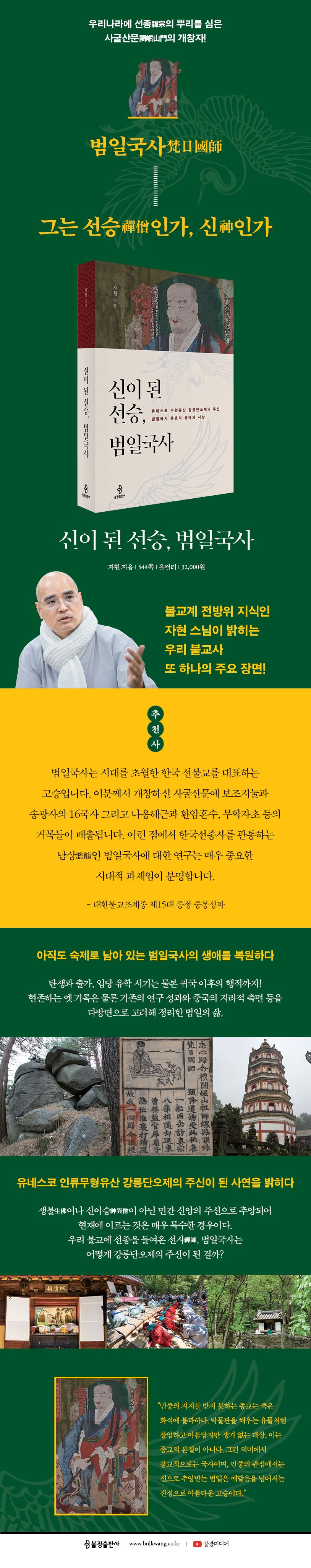 불교계 전방위 지식인 자현 스님의 이번 신간은 이런 범일국사와 관련한 우리 불교사의 주요 장면을 밝히는 데 목적이 있다. 그리하여 범일국사의 탄생과 출가, 입당 유학 시기는 물론 귀국 이후의 행적까지, 현존하는 옛 기록과 기존의 연구 성과, 중국의 지리적 측면 등을 다방면으로 고려해 그의 생애를 정리하는 것으로 시작된다. 이로써 범일의 생애에 관한 후대의 설화적 윤색, 강릉단오제의 주신과 관련된 측면을 더욱 명확히 접근할 수 있기 때문이다.