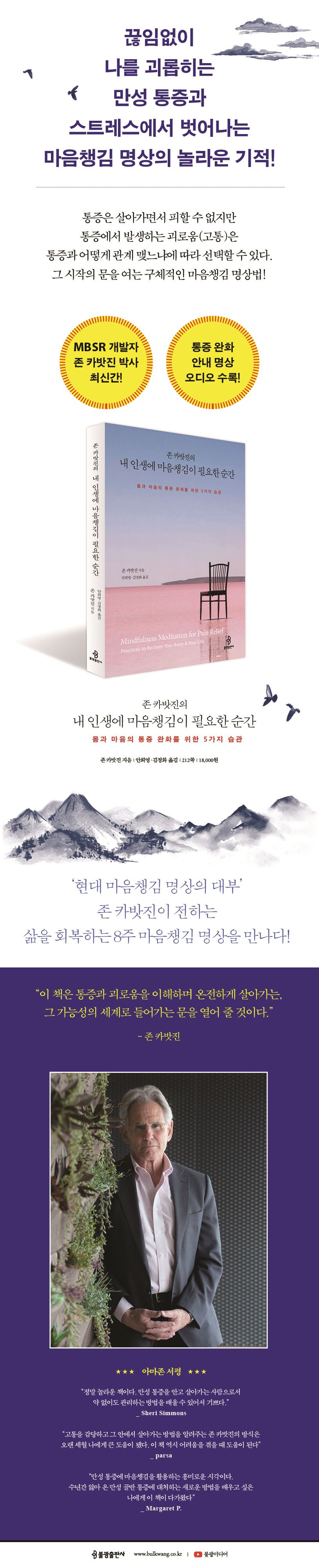 통증은 살아가면서 피할 수 없다. 하지만 통증에서 발생하는 괴로움(고통)은 통증과 어떻게 관계를 맺느냐에 따라 선택할 수 있다. 존 카밧진 박사는 저서 『내 인생에 마음챙김이 필요한 순간(Mindfulness Meditation for Pain Relief)』에서 원하지 않는 고통스러운 경험과 관계 맺는 완전히 새로운 방식이 있다고 말한다. 그러면서 약물이나 수술 등 의학적 치료법에 더 이상 도움을 받지 못하는 이들에게 현대 의학을 보완한 가장 효과적이고 실질적인 방법을 제안한다. 호흡 마음챙김, 통증에 대처하는 방법, 통증 관련 생각과 감정 다루기, 알아차림 속 휴식, 바디스캔 등 일상에서 실천하는 5가지 마음챙김 명상 수련을 제안한 그는 삶을 회복하는 놀라운 생각 습관까지 공유한다.