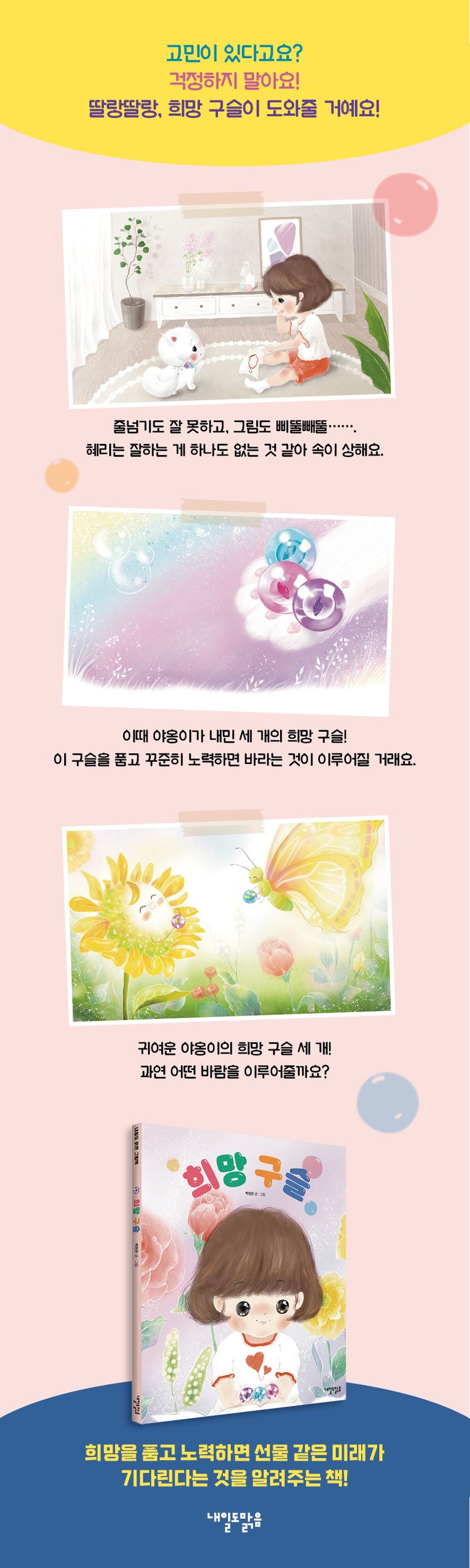 《희망 구슬》은 처음 해보는 일, 잘 못하는 일 앞에서 자신 없어 하는 아이들에게 희망을 품고 노력하면 꼭 받고 싶던 선물 같은 미래가 기다리고 있다는 것을 알려주는 책이다. 따뜻한 글과 그림이 가득한 이 책은 새로운 것을 시도하며 고민하고 걱정하는 아이들의 마음을 위로하고 용기를 심어준다. 이 책을 통해 열심히 노력하면 뭐든 할 수 있다는 자신감을 가질 수 있을 것이다.