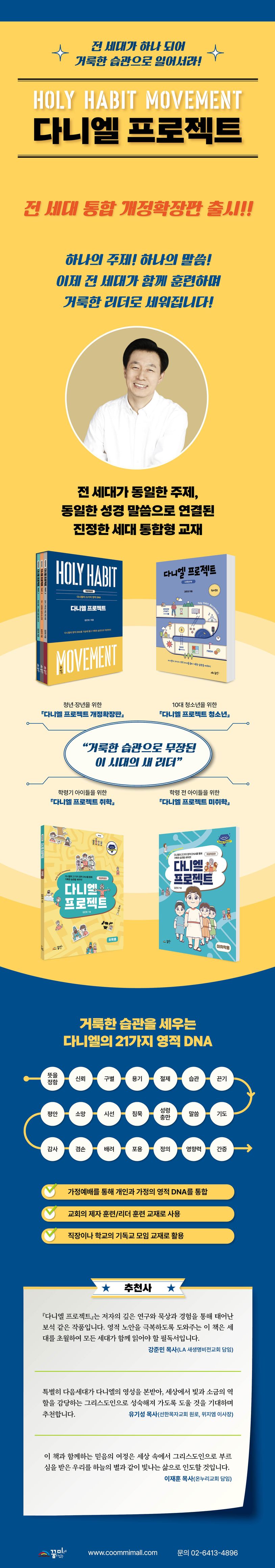 『다니엘 프로젝트 취학용』은 『다니엘 프로젝트 청장년용』을 기준으로 구성을 새롭게 리뉴얼하여 학령기 아이들이 청장년 세대와 동일한 말씀과 주제로 훈련을 이어갈 수 있도록 구성하였다. 이를 통해, 전 세대 간 영적 일관성과 통합성을 강화하여 빠르게 변하고 혼란스러운 세상 속에서 아이들이 다니엘처럼 신앙의 거목으로 자라게 하는 다니엘의 영적 DNA를 제공한다.
