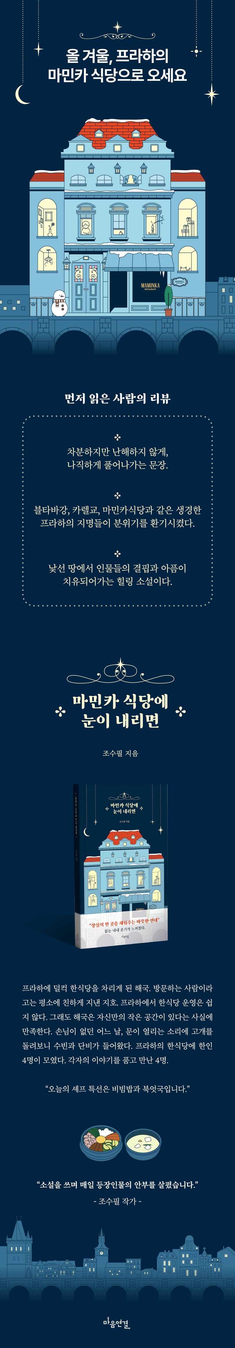 저마다의 이유로 모국을 떠난 해국, 수빈, 지호, 단비. 한식당 마민카를 중심으로 4명의 한국인이 모였다. 천천히 그리고 하나씩 서로 간직한 슬픔을 꺼낸다. 이방인일 수밖에 없는 프라하에서 서로에게 전한 잔잔한 치유와 위로. 겨울 프라하의 추위를 녹여낸 따뜻한 마음를 전달한다.