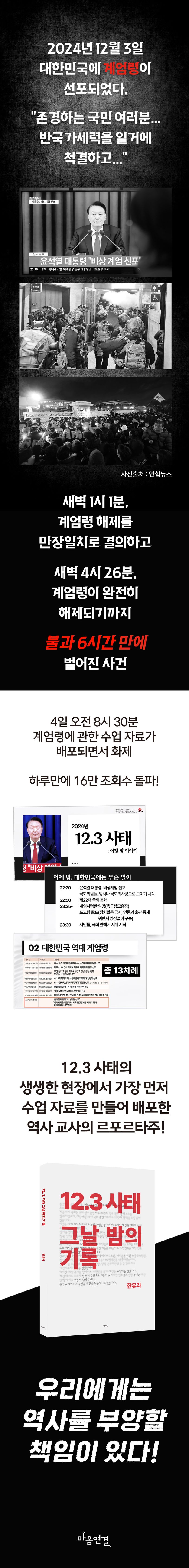 이 책은 계엄령 선포 후 해제까지 6시간의 정황을 담은 르포르타주다. 사실상 12.3 계엄령을 다룬 첫번째 책으로, 계엄령 수업자료를 배포해 하루 만에 16만 조회수를 달성한 역사 교사의 기록이다. 본격 탄핵 정국에 앞서 짚고 가야 할 역사적 맥락을 다뤘다. 어떠한 이해관계도 얽히지 않은 정직한 기록이다.