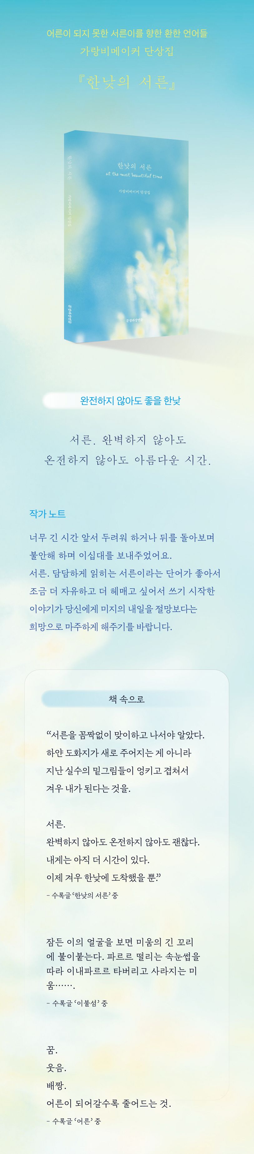 가랑비메이커는 겨우 내가 된 자리에서 절망보다 희망에 가까운 마음을 움켜쥘 수 있는 것은 여전히 모든 게 현현한 한낮에 있다고, 특유의 예리한 관찰력과 섬세한 문체로 고백한다. 서툴고 설익어서 이따금 서러워지더라도 희미하기에, 진정 그러하기에 아름다운 한낮의 서른께의 문장들이 당신의 서른즈음의 날들을 따스하게 덮어주기를.