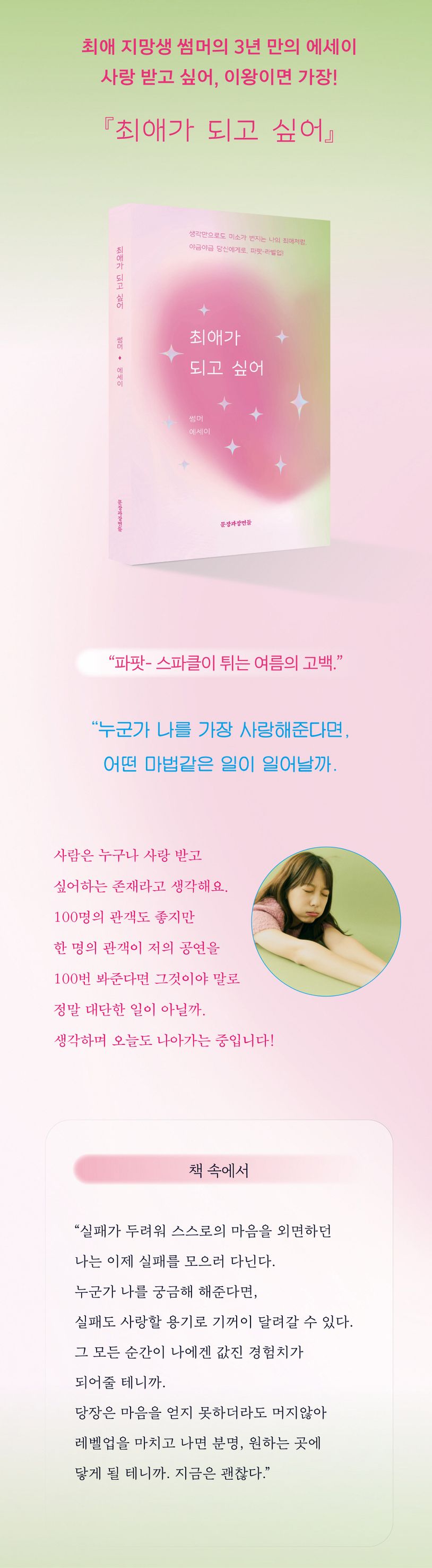 여름이면 어김 없이 새로운 이야기를 품고 새어 나오는 미소를 숨기며 등장하는 썸머 작가의 3년만의 에세이 『최애가 되고 싶어』는 배우와 작가로서 부지런히 자리를 옮겨 다니며 사랑 받고 싶은 마음을 진솔하게 고백하는 이야기이다.