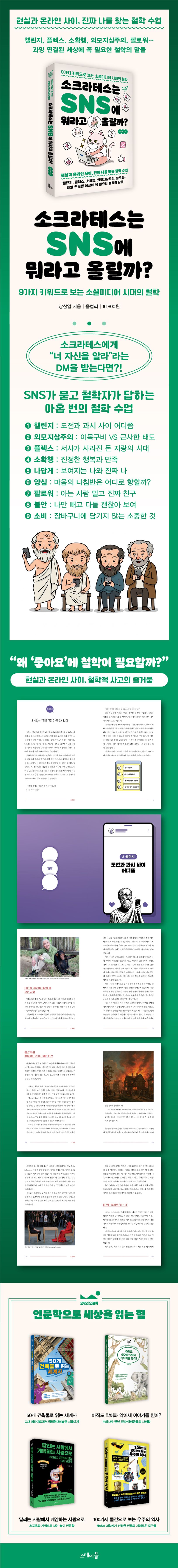 《소크라테스는 SNS에 뭐라고 올릴까?》는 SNS 속 키워드 9가지를 선정해 소크라테스, 아리스토텔레스, 에피쿠로스, 쇼펜하우어 등 다양한 철학자들의 사상과 함께 철학적으로 풀어낸 책이다. 선한 영향력을 공유하기 위해 시작되었다가 조회수를 위한 유행이 되어버린 ‘챌린지’, 밑바닥부터 올라와 성공한 힙합 정신이 담긴 ‘플렉스’에서 서사가 사라진 최근의 모습, ‘팔로워’보다 소중한 내 곁의 사람들 등이 담겨 있다.