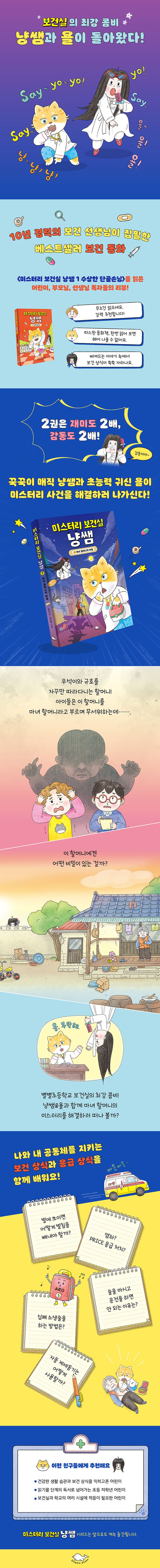 1권 출시 이후 아이들뿐 아니라 학부모, 선생님에게도 뜨거운 사랑을 받은 〈미스터리 보건실 냥쌤〉 시리즈는 귀엽고 유쾌한 이야기에 유익한 정보까지 담아 초등 저학년 어린이들이 재미있게 읽을 수 있는 좋은 동화라는 평가를 받았다. 2권에서는 더욱 흥미진진한 인물들, 감동적인 사연과 함께 다시 한번 알차고 실용적인 정보가 펼쳐진다.