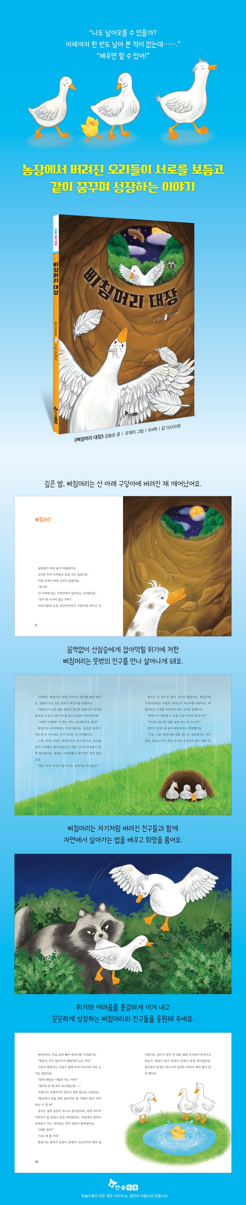 『삐침머리 대장』은 농장에서 버려진 오리들이 자연에서 서로 힘을 합쳐 살아가는 이야기예요. 오리들은 서로를 보듬고 같이 꿈꾸며 성장해 가요. 자기밖에 모르던 삐침머리는 남을 생각하고 도울 줄 아는 듬직한 마음을 가지게 돼요. 예민하고 날카롭던 꽁지는 친구들에게 서서히 마음을 열고, 구름이도 친구들 덕분에 몸과 마음을 치유해요. 책을 읽다 보면 저절로 삐침머리와 친구들을 응원하게 되지요. 이 책을 통해 사람이 만든 시설에서 가축으로 길러지는 동물들과 그 생명에 대해 생각해 보고, 서로 도우며 힘이 되어 주는 소중한 마음을 배울 수 있어요.